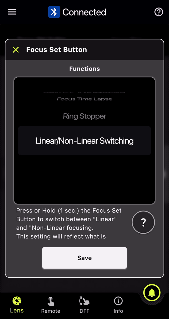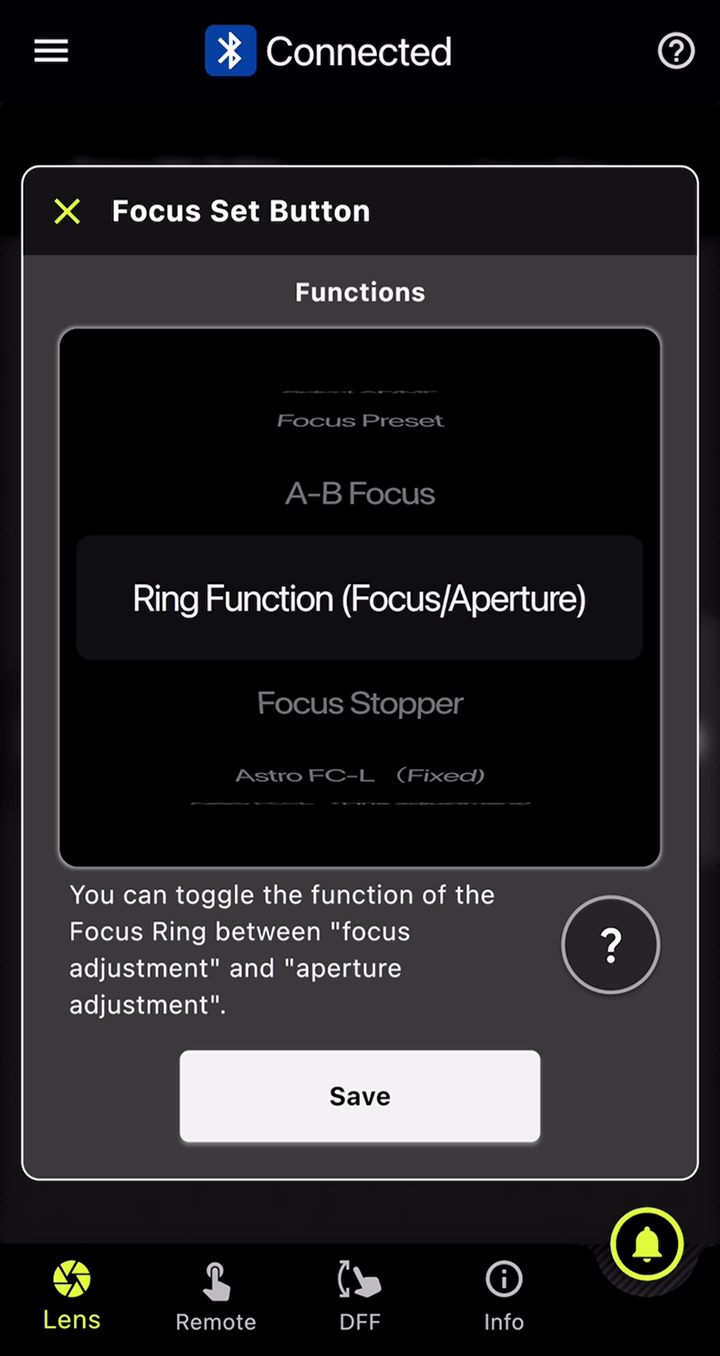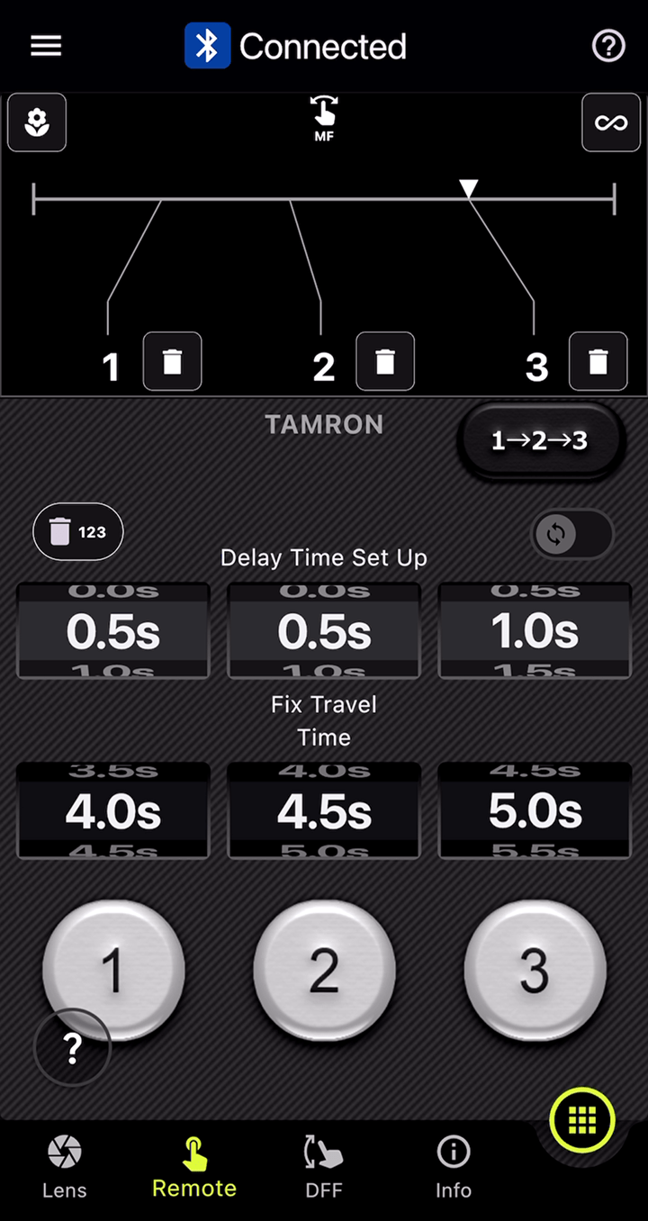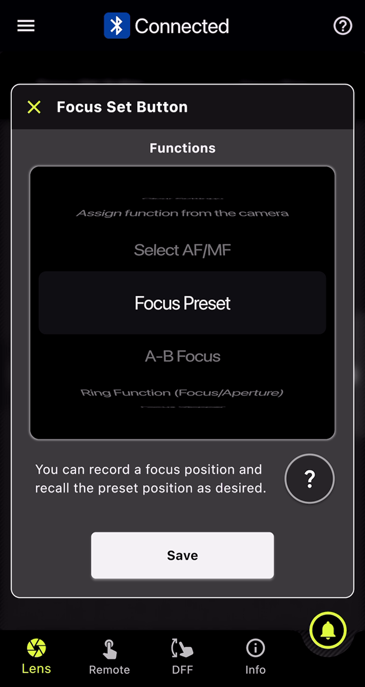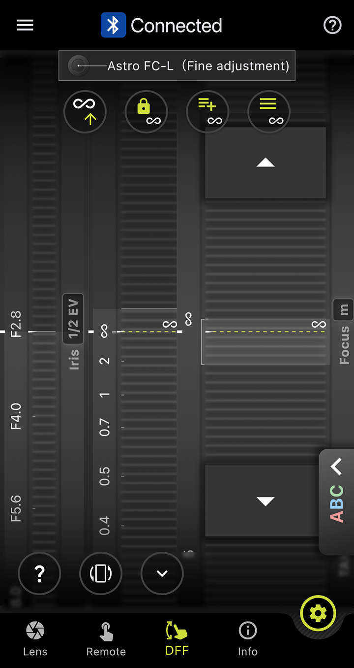 You can set markers for both the focus and aperture rings, and with the DFF (Digital Follow Focus) screen, shift them instantly to the preset positions with a single tap.